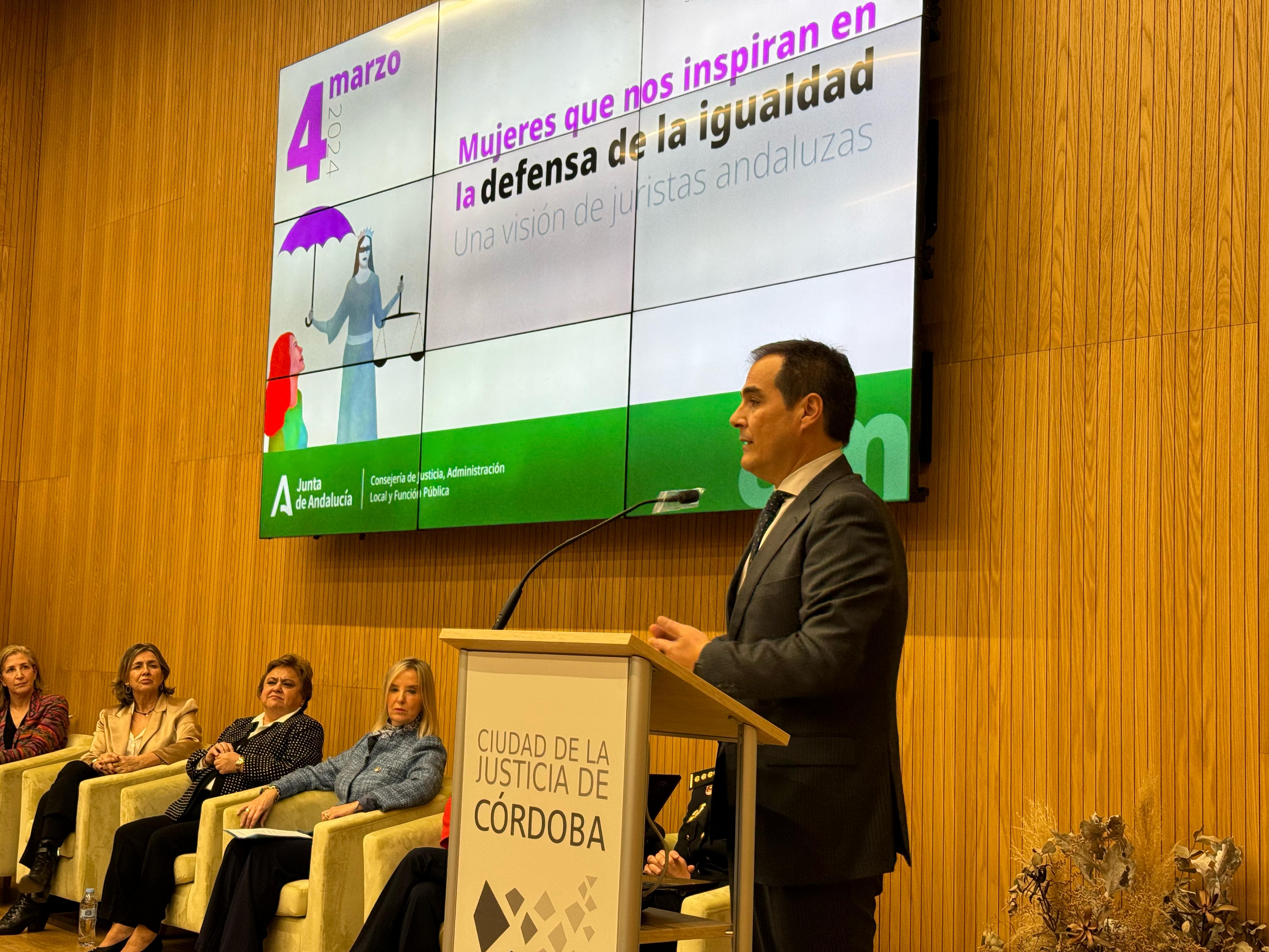 Nieto ha inaugurado hoy en la Ciudad de la Justicia de Córdoba la segunda edición de la Jornada ‘Mujeres que nos inspiran en la defensa de la igualdad’, un encuentro anual que la Consejería comenzó a organizar el año pasado en el marco de la celebración del Día Internacional de la Mujer el 8 de marzo. En este sentido, ha defendido la importancia de mantener estas jornadas para “recibir aportaciones” sobre cómo garantizar a las mujeres la oportunidad de que “ocupen responsabilidades máximas en un área como la Justicia tremendamente feminizada”.
