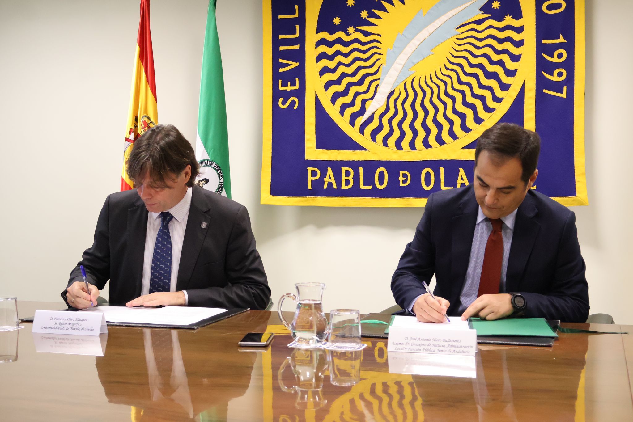 El consejero de Justicia, Administración Local y Función Pública, José Antonio Nieto, y el rector de la Universidad Pablo de Olavide (UPO), Francisco Oliva, han suscrito hoy sendos convenios de colaboración para que estudiantes de Ciencias Sociales y Jurídicas, Ciencias de la Salud y Ciencias de la Educación completen su formación académica con prácticas en los centros que trabajan con menores infractores gestionados por la Junta y, por primera vez, también en servicios de apoyo a la Justicia de la Consejería como los Puntos de Encuentro Familiar (PEF) o el Servicio de Asistencia a Víctimas de Andalucía (SAVA).
