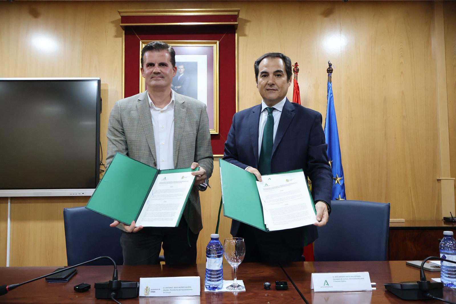 El consejero de Justicia, Administración Local y Función Pública, José Antonio Nieto, ha firmado hoy un protocolo de colaboración con el alcalde de Estepa, Antonio Jesús Muñoz, por el que el Ayuntamiento cederá a la Junta de Andalucía el edificio del antiguo colegio de Los Remedios y un solar anexo para poder construir la nueva sede judicial del municipio. Esto permitirá contar con una superficie de 3.450 m2 que multiplica por más de seis la del edificio actual y garantiza espacio suficiente no solo para cubrir las necesidades de hoy sino para el crecimiento futuro en un partido judicial cuya cabecera es un municipio estratégico de Andalucía que lleva décadas incrementando su población y actividad.