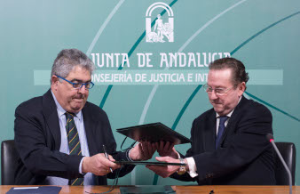 El consejero de Justicia e Interior, Emilio de Llera, y el presidente del Consejo Andaluz de Colegios de Abogados, José Pascual Pozo, han firmado hoy un convenio para volver a poner en marcha el servicio de orientación jurídica penitenciaria en Andalucía del que se podrá beneficiar la población reclusa de las 13 cárceles de esta comunidad.