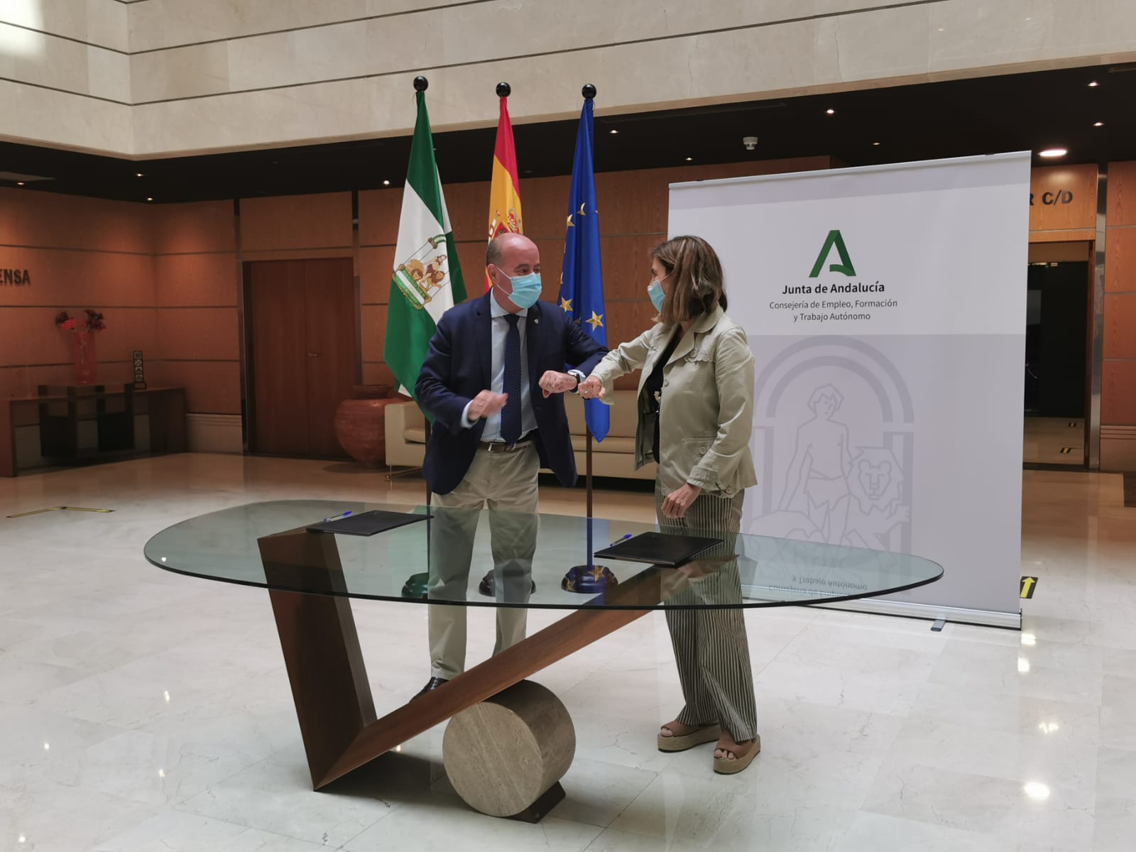Rocío Blanco ha hecho estas declaraciones durante la firma, hoy en Sevilla de un convenio de colaboración con el alcalde de Antequera, Manuel Barón, que establece la colaboración del Servicio Andaluz de Empleo en la selección de candidatos para proyectos de empleo que desarrollará el propio ayuntamiento con fondos municipales, y que estarán enclavados en la misma línea fijada por la Iniciativa AIRE, lo que supondrá en definitiva ampliar el impacto que tendrá este programa en el municipio.