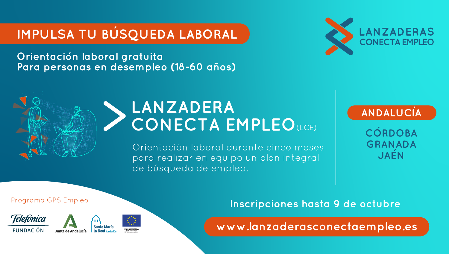 Las personas interesadas en participar en las próximas Lanzaderas Conecta Empleo de Córdoba, Granada y Jaén disponen hasta el 9 de octubre para realizar su inscripción en la web www.lanzaderasconectaempleo.es. También tienen la posibilidad de apuntarse de forma presencial a las Lanzaderas Conecta Empleo de Jaén y Granada, concertando cita previa en el teléfono 953 245 520 y 958 185 280, respectivamente.