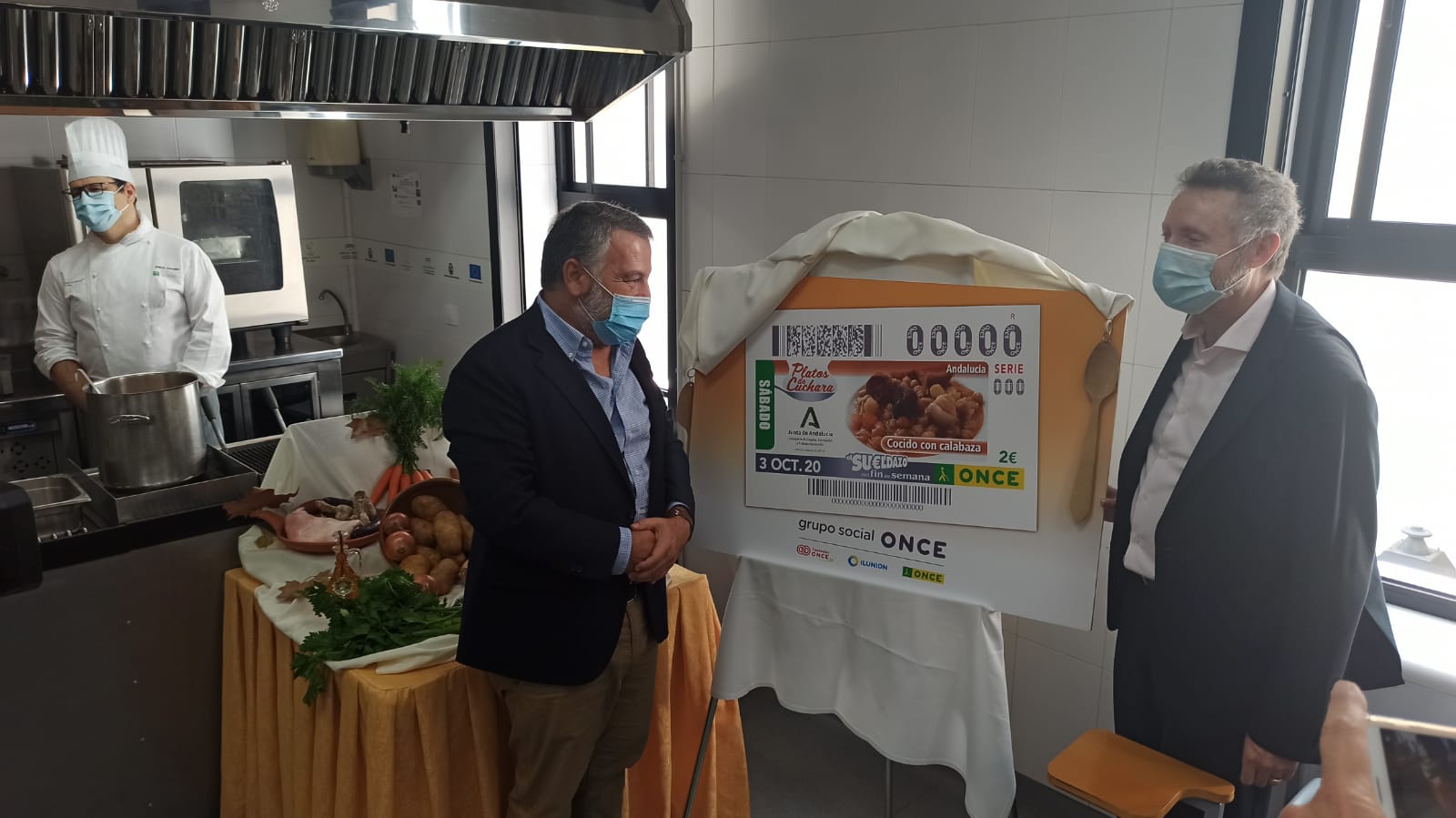 La Escuela de Hostelería de Cádiz, uno de los once centros que componen la red de Escuelas de Formación Profesional para el Empleo del Servicio Andaluz de Empleo, ha acogido hoy la presentación del primero de los 19 cupones de la ONCE que conforman una nueva seria titulada “Platos de cuchara”, con el que esta organización invita a degustar y promociona platos de cuchara de la cocina tradicional de las distintas comunidades autónomas. El primer cupón, cuyo sorteo se celebrará el sábado 3 de octubre, estará dedicado al cocido con calabaza, plato típico de la cocina de Andalucía, y que ha sido elaborado y explicado en directo durante el desarrollo del acto de presentación por el jefe de cocina de la Escuela, Juan Ramón González.