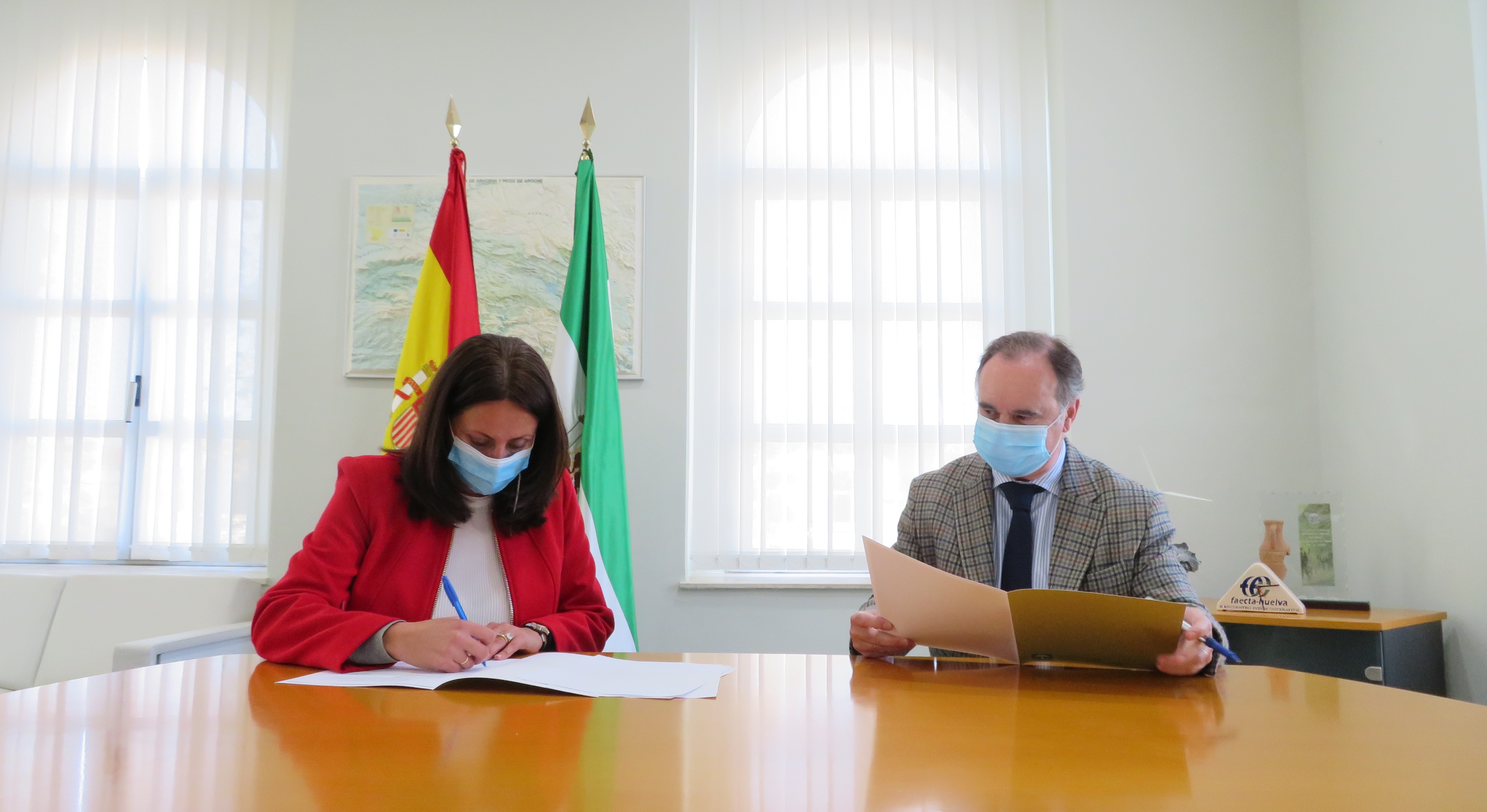El delegado de Empleo, Formación, Trabajo Autónomo, Transformación Económica, Industria, Conocimiento y Universidades, y director provincial del Servicio Andaluz de Empleo (SAE) de Huelva, Antonio Augustín, y la delegada de Educación y Deporte, Estela Villalba Valdayo, han suscrito un acuerdo de colaboración en materia de orientación profesional e intermediación en el empleo destinado a los alumnos onubenses matriculados en los centros de Educación Secundaria, Ciclos Formativos y Educación de Adultos.