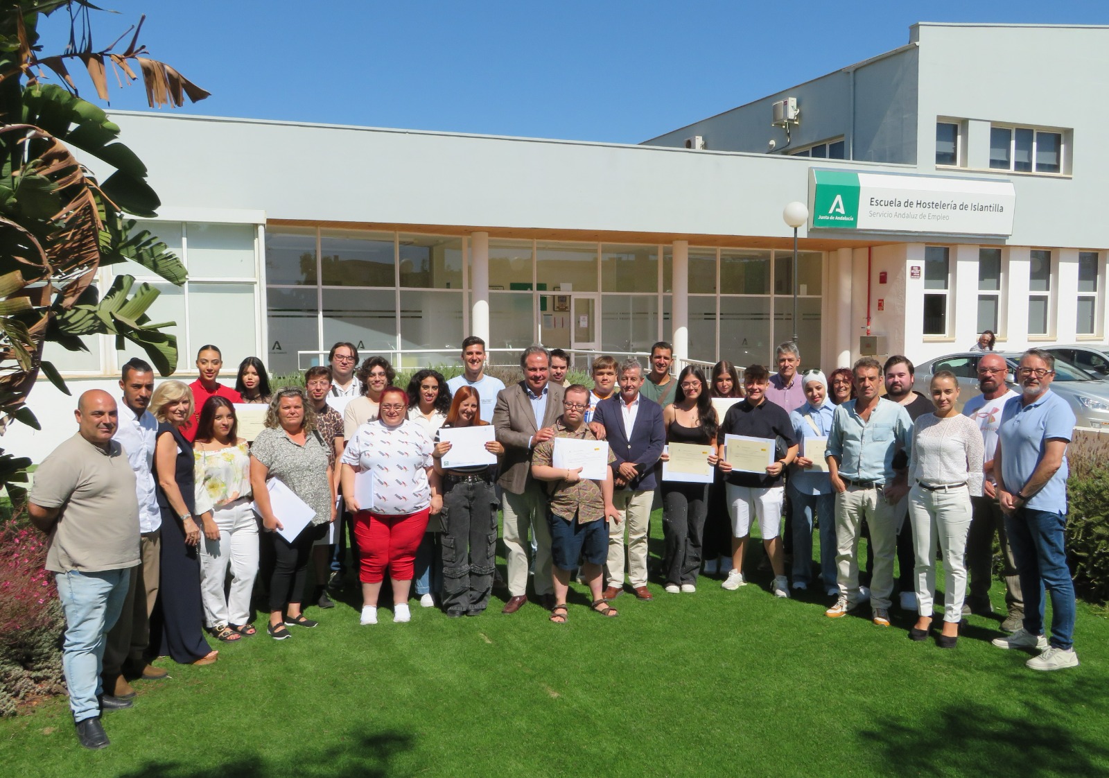 La Escuela de Hostelería de Islantilla, adscrita al Servicio Andaluz de Empleo (SAE), ha finalizado el curso 2024-25 con la entrega de diplomas acreditativos de los 45 alumnos que concluyeron el pasado mes de junio el periodo de prácticas profesionales en 14 prestigiosos establecimientos hosteleros, hoteles y obradores de la costa occidental onubense con los que el SAE ha establecido diferentes convenios de colaboración.