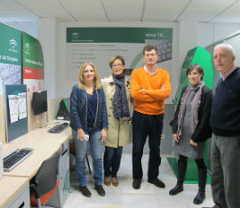 La delegada territorial de Economía, Innovación, Ciencia y Empleo en la zona TIC de la oficina SAE de La Merced, junto a técnicos del SAE.