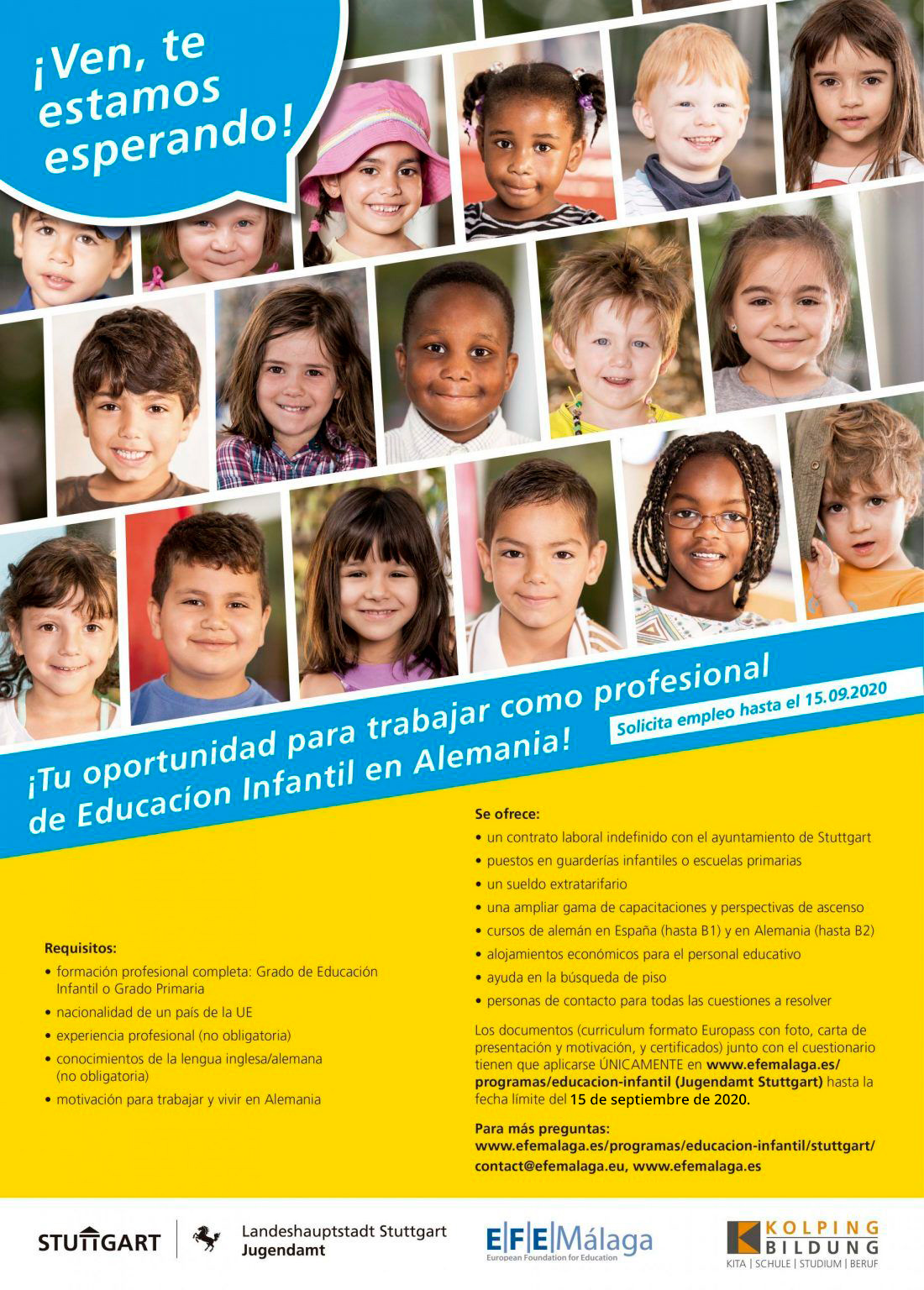 - Puestos de educadores infantiles, especialistas en pedagogía de 0 a 6 años y profesores de educación primaria, en las ciudades de Stuttgart. - Ayuda en la búsqueda de alojamientos económicos en Alemania. - Personas de contacto para todas las cuestiones a resolver. - Una vez finalizado el periodo de contratación inicial y tras la homologación del título en Alemania, se obtendrá un contrato laboral indefinido y un incremento del salario inicial. - Salario inicial de 1.585 € brutos incrementándose progresivamente a partir de obtener el título B2 en Alemania y la homologación del título, hasta alcanzar los 3.036 €.