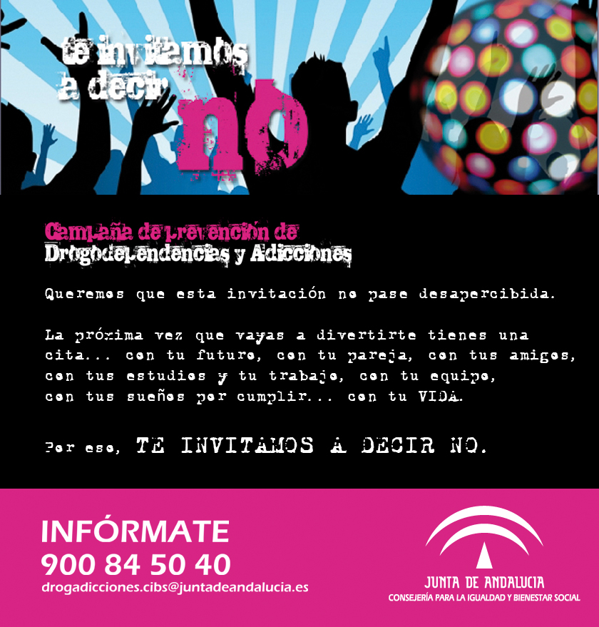 Por ello “TE INVITAMOS A DECIR NO” es un mensaje para reforzar la decisión propia de no consumir o abusar del consumo de drogas frente a la presión del grupo. Es un guiño a las típicas invitaciones de discotecas y pubs que generalmente se relacionan con el consumo de alcohol y otras sustancias, además de ofrecer otras formas de disfrutar en el tiempo libre. No se trata de un lema prohibitivo, sino de una invitación a elegir con conocimiento de causa, sabiendo de antemano que todo mensaje imperativo es rechazado por el público juvenil.