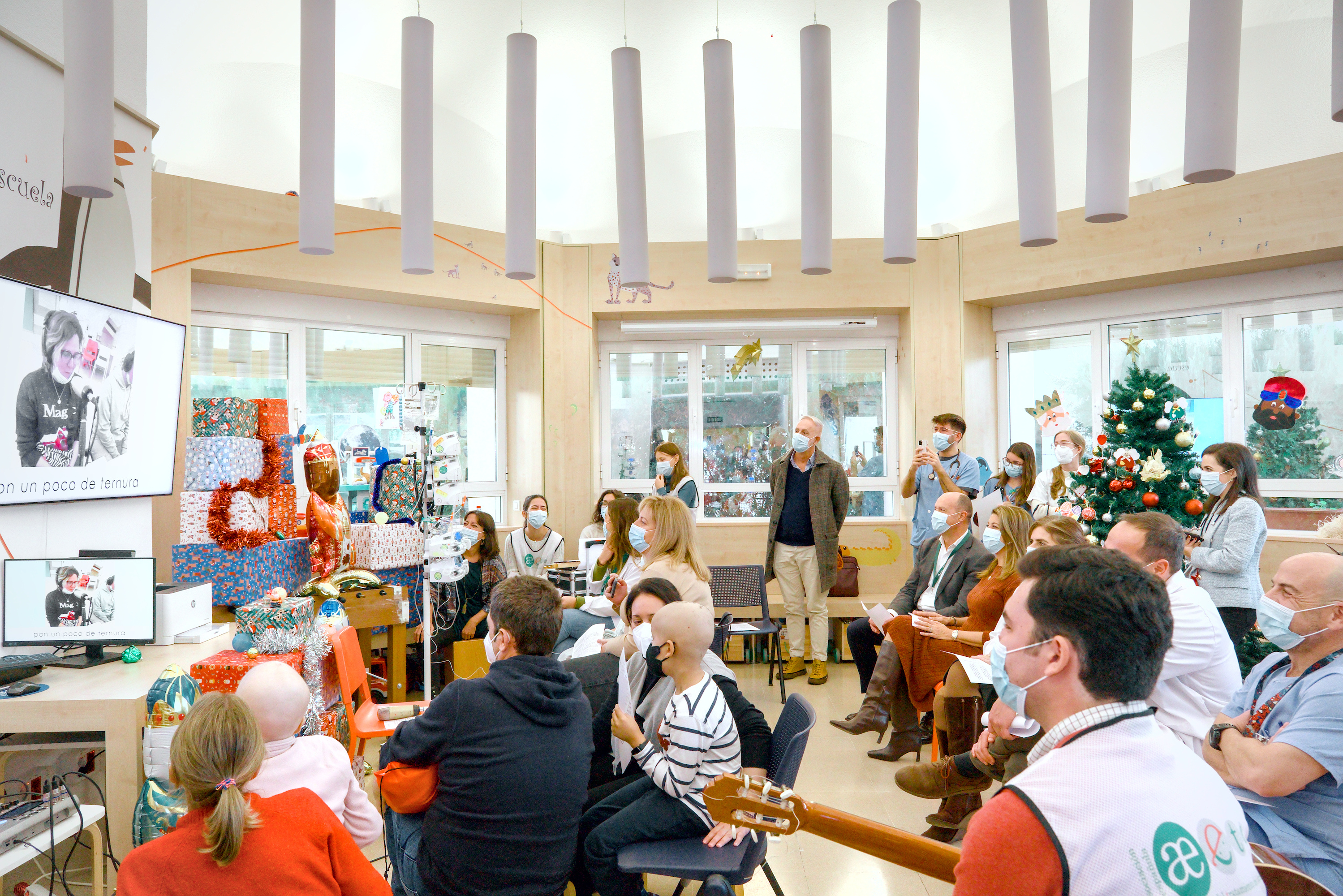 Miembros de la Asociación Española para los Efectos del Tratamiento del Cáncer acompañaron a los pequeños con guitarra y percusión en este villancico que recuerda en su estribillo que “no importan los lugares, y no importa donde estés, como tú te encuentres, te acompañaré”.