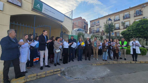 La delegada territorial de la Consejería de Sanidad, Elena González, junto al director gerente del Área de Gestión Sanitaria Norte de Jaén, José Luis García, miembros del equipo directivo, todas las organizaciones sindicales de la Junta de Personal así como profesionales sanitarios del centro de salud de Arjona se han concentrado de forma conjunta este lunes a las 9 horas en la puerta del edificio para mostrar su apoyo y solidaridad a las dos profesionales de este centro de Atención Primaria, perteneciente a este área sanitaria, por la agresión sufrida el pasado lunes,16 de marzo, mientras realizaban su trabajo asistencial.