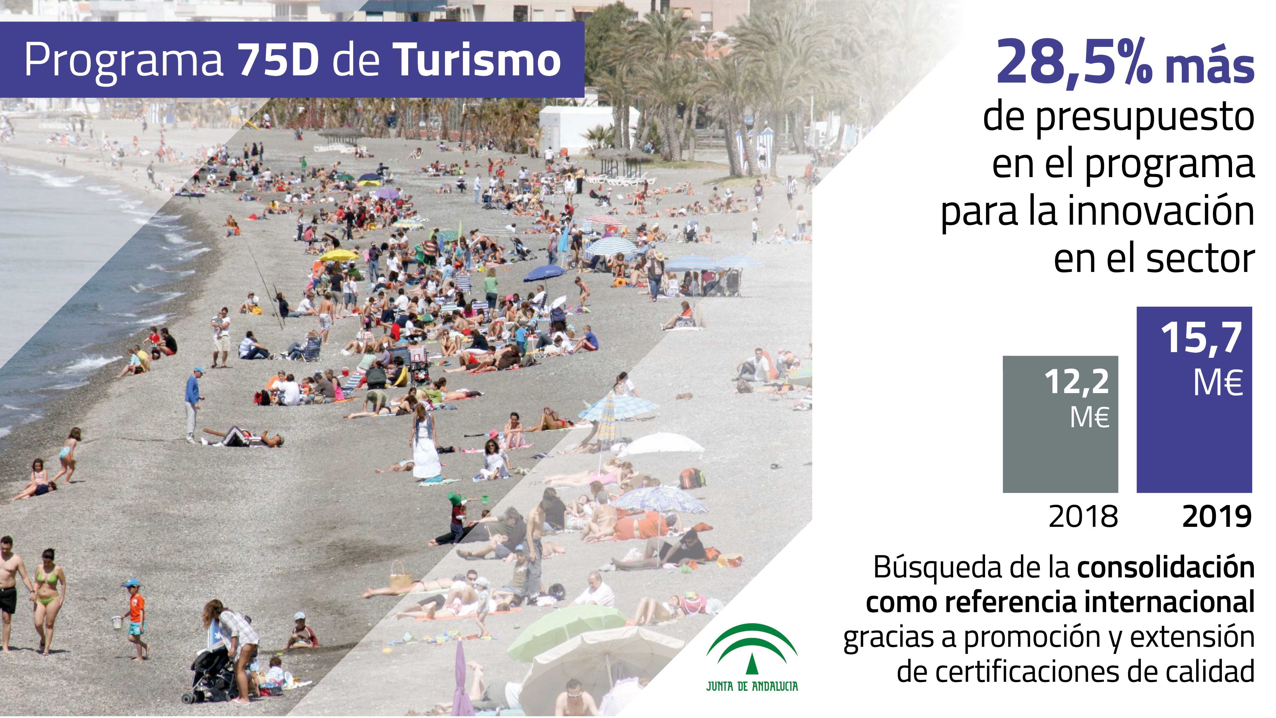 Es por ello que el Programa 75D de Calidad, Innovación y fomento del turismo, incluido en el proyecto de presupuestos de Andalucía para 2019, recoge una partida de 15,7 millones de euros, lo que supone un incremento del 28,5%, 3,5 millones de euros más. La calidad es sinónimo de satisfacción y fidelidad, contribuye a la excelencia y fortalece la imagen del destino Andalucía frente a una competencia que basa su estrategia en la bajada de precios.