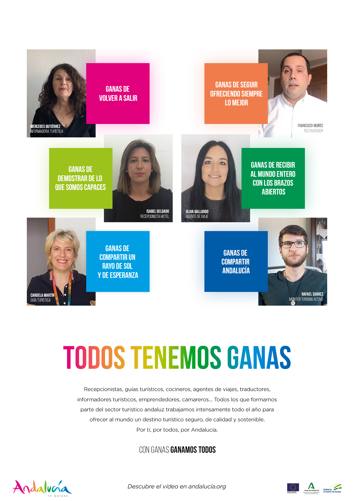 La Consejería de Turismo, Regeneración, Justicia y Administración Local pondrá en marcha a partir de mañana, 22 de mayo, una campaña con el lema ‘Todos tenemos ganas. Con ganas ganamos todos’ con la que se pretende enviar un mensaje de apoyo al sector turístico andaluz y al mismo tiempo generar confianza en la ciudadanía una vez que ha comenzado a recuperarse la actividad tras la crisis del Covid19. “Queríamos que la primera campaña de comunicación que lanzamos desde que se decretó el estado de alarma fuera para una actividad que tanto ha sufrido y tanto sigue sufriendo esta crisis”, ha apuntado el vicepresidente de la Junta, Juan Marín.
