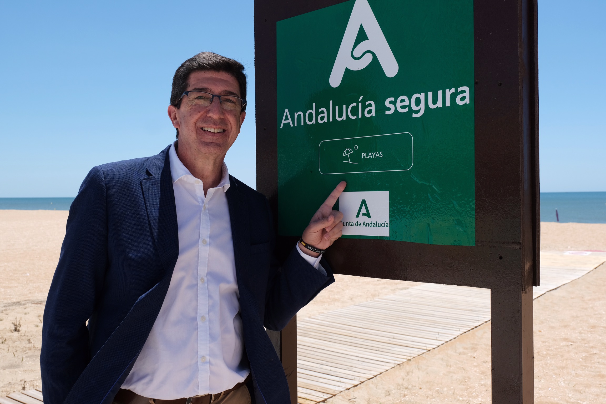 El vicepresidente de la Junta de Andalucía y consejero de Turismo, Regeneración, Justicia y Administración Local, Juan Marín, ha visitado hoy la playa de La Antilla, en el municipio onubense de Lepe, para informar de que esta playa es la primera de Andalucía en contar con el distintivo ‘Andalucía Segura’.
