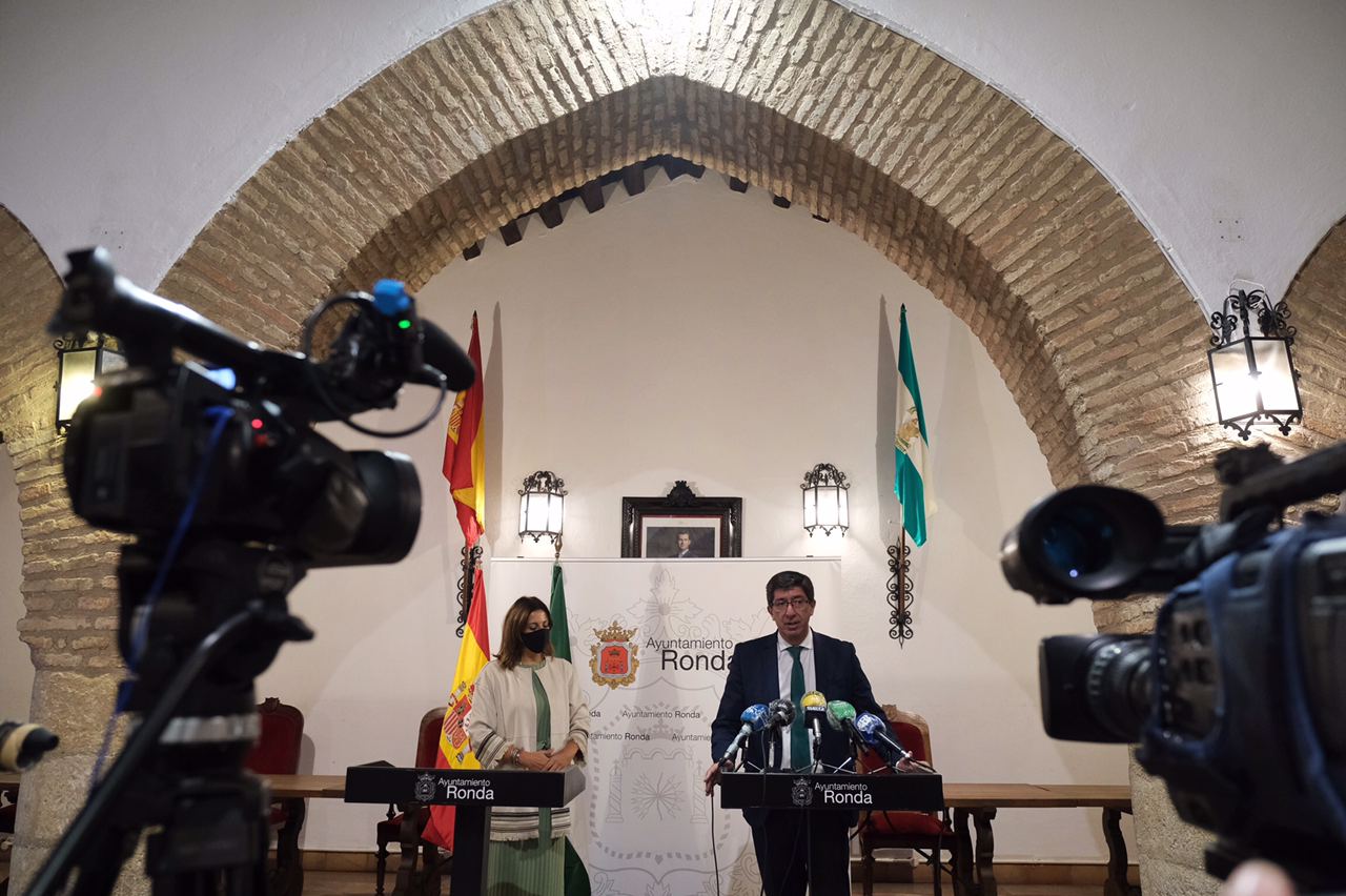 El vicepresidente de la Junta de Andalucía y consejero de Turismo, Regeneración, Justicia y Administración Local, Juan Marín, ha visitado hoy la localidad malagueña de Ronda, donde ha mantenido una reunión con su alcaldesa, María de la Paz Fernández, y ha conocido las instalaciones de la Oficina de Turismo del municipio.