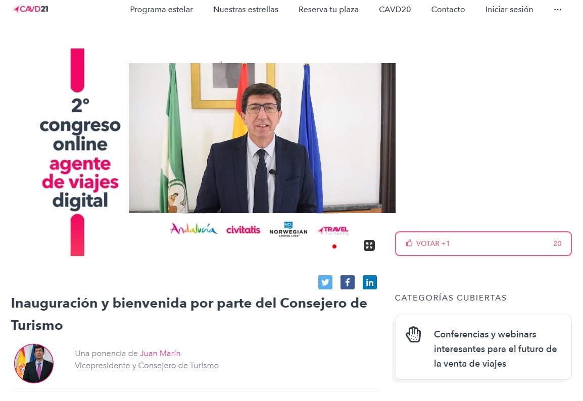 Marín, que ha inaugurado el 2º Congreso del Agente de Viajes Digital, que se celebra de forma telemática y reunió en su primera edición a unos 3.000 profesionales, ha agradecido el empuje de este sector a la comunidad y ha valorado especialmente su esfuerzo por reinventarse en la actual situación.