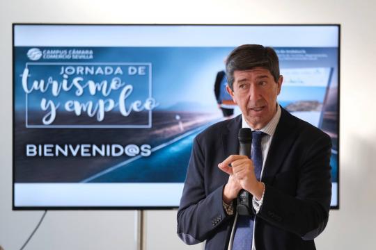 El vicepresidente de la Junta de Andalucía y consejero de Turismo, Regeneración, Justicia y Administración Local, Juan Marín, ha participado hoy en unas jornadas organizadas por su consejería junto a la Cámara de Comercio de Sevilla, que han tratado sobre el Empleo y el Turismo. Durante su intervención, ha destacado “la importancia de la cualificación de los profesionales turísticos al ser la cara más visible del sector”.