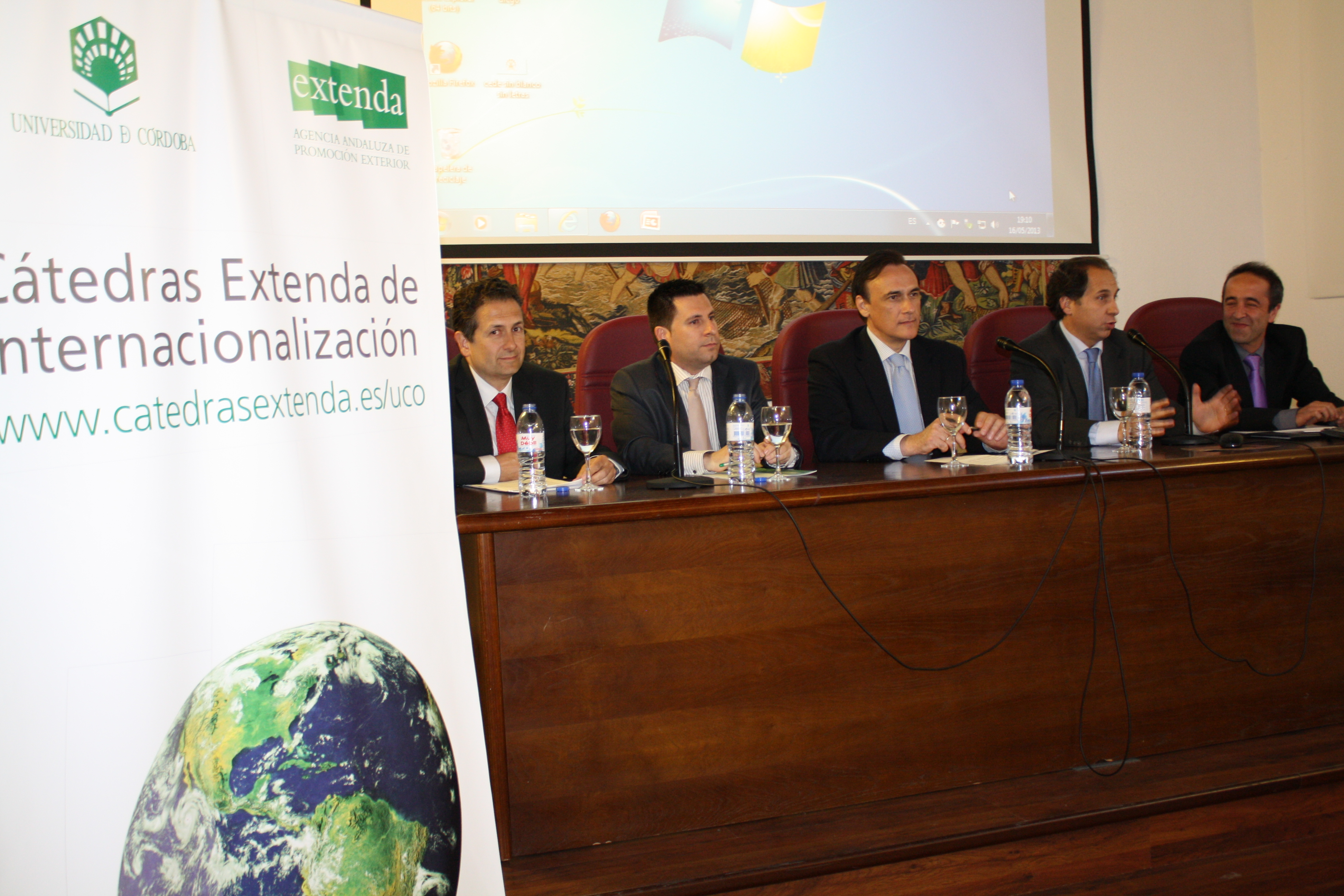 Director del Master en Comercio Exterior e Internacionalización de Empresas, Fernando Fuentes, Delegado de Economía, Innovación, Ciencia y Empleo, José Ignacio Expósito , Vicerrector de Estudios de Postgrado y Formación Continua de la Universidad de Córdoba, José Carlos Gómez, Decano de la Facultad de Derecho y Ciencias Económicas y Empresariales, Miguel Agudo y Diego Quer, conferenciante.