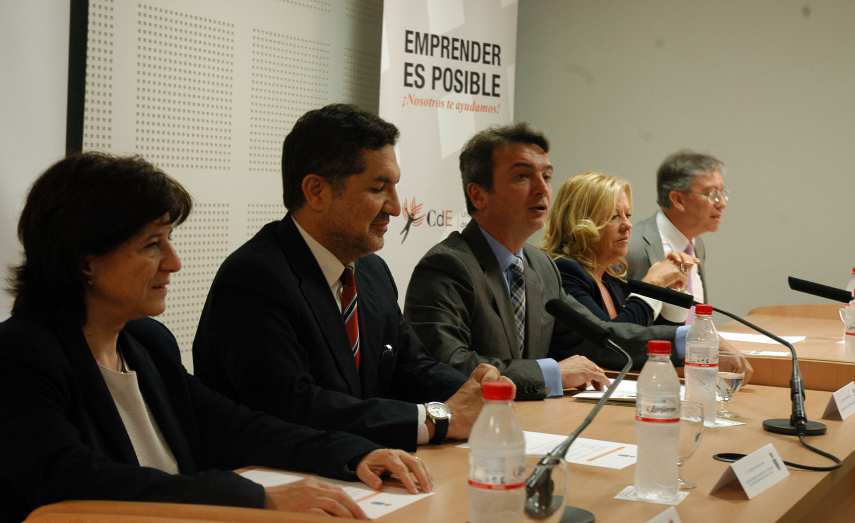 Sra. Dña. Alicia Coduras, Directora Técnica GEM España; Sr. D. Gaspar Llanes, Secretario General de Economía; Sr. D. Eduardo González, Rector Magfco. de la UCA; Sra. Dña. Ana Alonso, Presidenta Consejo Social UCA; y Sr. D. José Ruiz Navarro, Director GEM Andalucía.