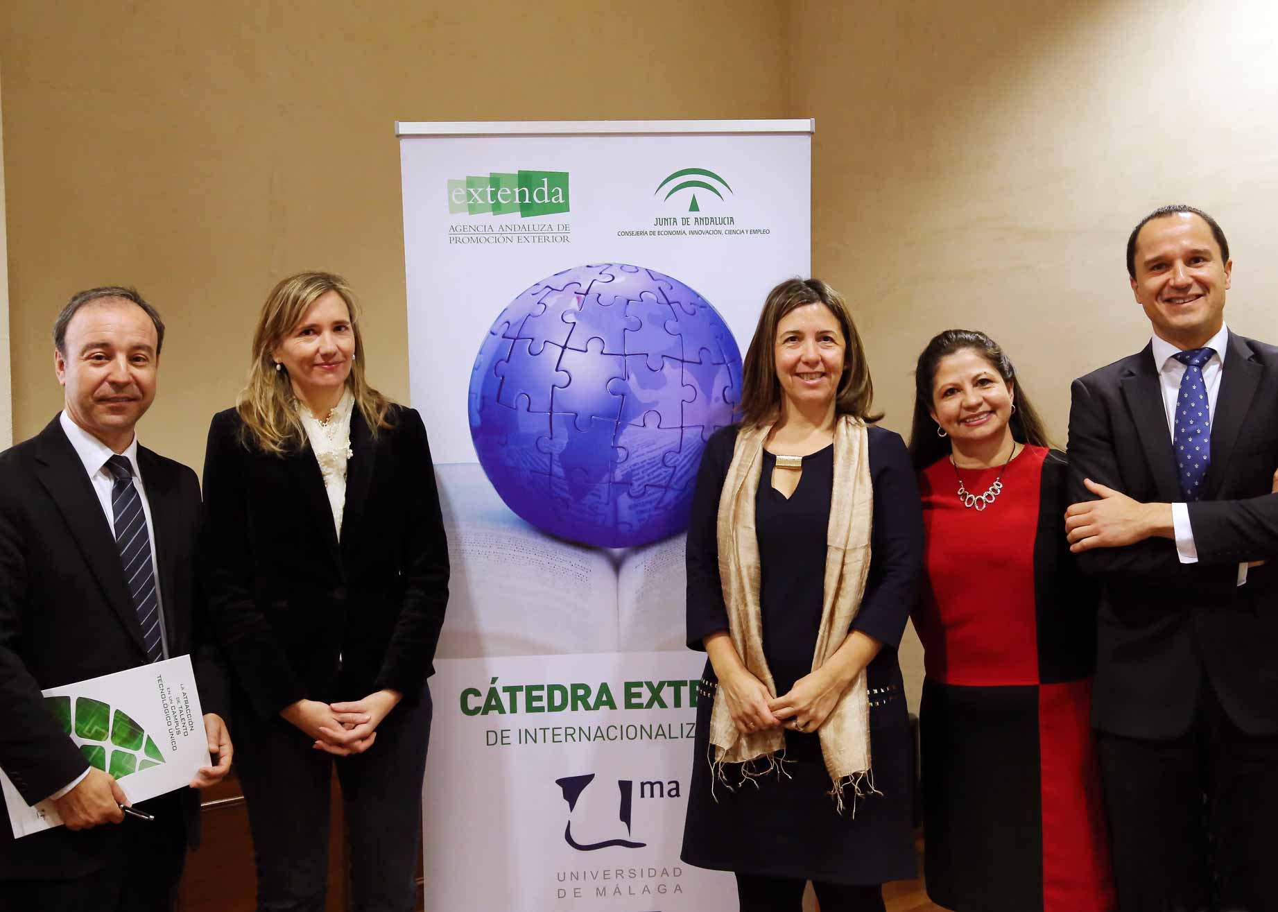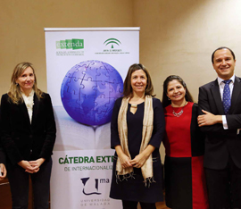 Jornada Cátedra de Málaga con el vicerrector de Comunicación y Proyección Internacional, Pedro Farias; de la consejera delegada de Extenda, Vanessa Bernad; y de la directora de Proyección Internacional y Cooperación de la UMA, y co-directora de la Cátedra Extenda de la Universidad de Málaga, Mª Ángeles Rastrollo.